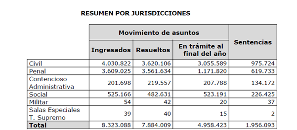 Por jurisdicciones, las estadísticas muestran que los asuntos de nuevo ingreso en el orden Civil fueron 837.992, un 10 % menos que un año antes; los resueltos sumaron 950.867, un 11,1 % más, y quedaron en trámite 2.849.018, un 16 % más que al final del segundo trimestre de 2024.