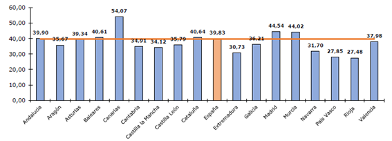 Los territorios que registraron una tasa inferior a la nacional fueron Asturias (39,34), Comunidad Valenciana (37,98), Galicia (36,21), Castilla y León (35,79), Aragón (35,67), Cantabria (34,91), Castilla-La Mancha (34,12), Navarra (31,79), Extremadura (30,73), País Vasco (27,85) y La Rioja (27,48.