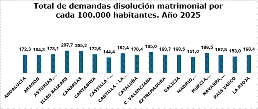 Poniendo en relación las demandas de disolución matrimonial del total del año con la población a 1 de enero de 2025, el número de demandas de disolución por cada 100.000 habitantes en España fue de 171,9.