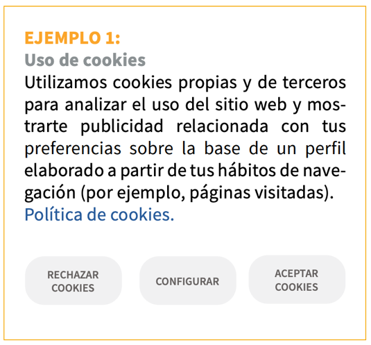 - Es obligatorio que la información de primera capa (es decir, en el banner o el CMP) incluya la opción de rechazar las cookies. Se trata de un cambio sustancial debido a que ya no serán válidos los banners o CMPs que, por ejemplo, únicamente incluían las opciones de “ACEPTAR” y como alternativa, “CONFIGURAR COOKIES”.